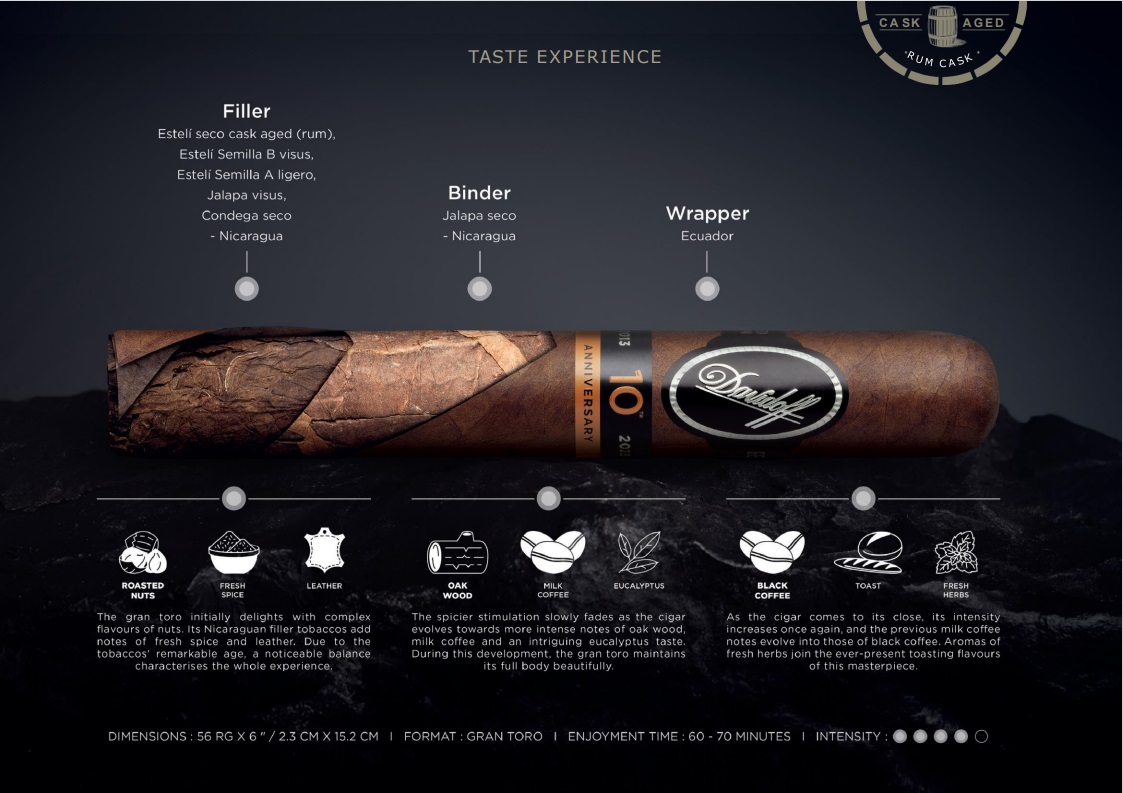 Τα καπνά αυτής της συλλεκτικής σειράς έχουν παλαιωθεί στο σύνολο σχεδόν για 45 χρόνια αφού στα ήδη υπάρχοντα καπνά της κλασσικής σειράς προστέθηκαν καπνά παλαίωσης 9 ετών από το Esteli που έχουν ωριμάσει σε βαρέλια από ρούμι ώστε να αποκτήσουν μια πιο βαθιά, γεμάτη και μοναδική γεύση. Η συλλεκτική σειρά Davidoff Nicaragua 10th Year Anniversary προσφέρει απλόχερα μια γευστική περιπέτεια που ξεκινά με νότες καβουρδισμένων ξηρών καρπών, συνεχίζει με νότες κέρδου και τελειώνει με έντονα αρώματα μαύρου καφέ.