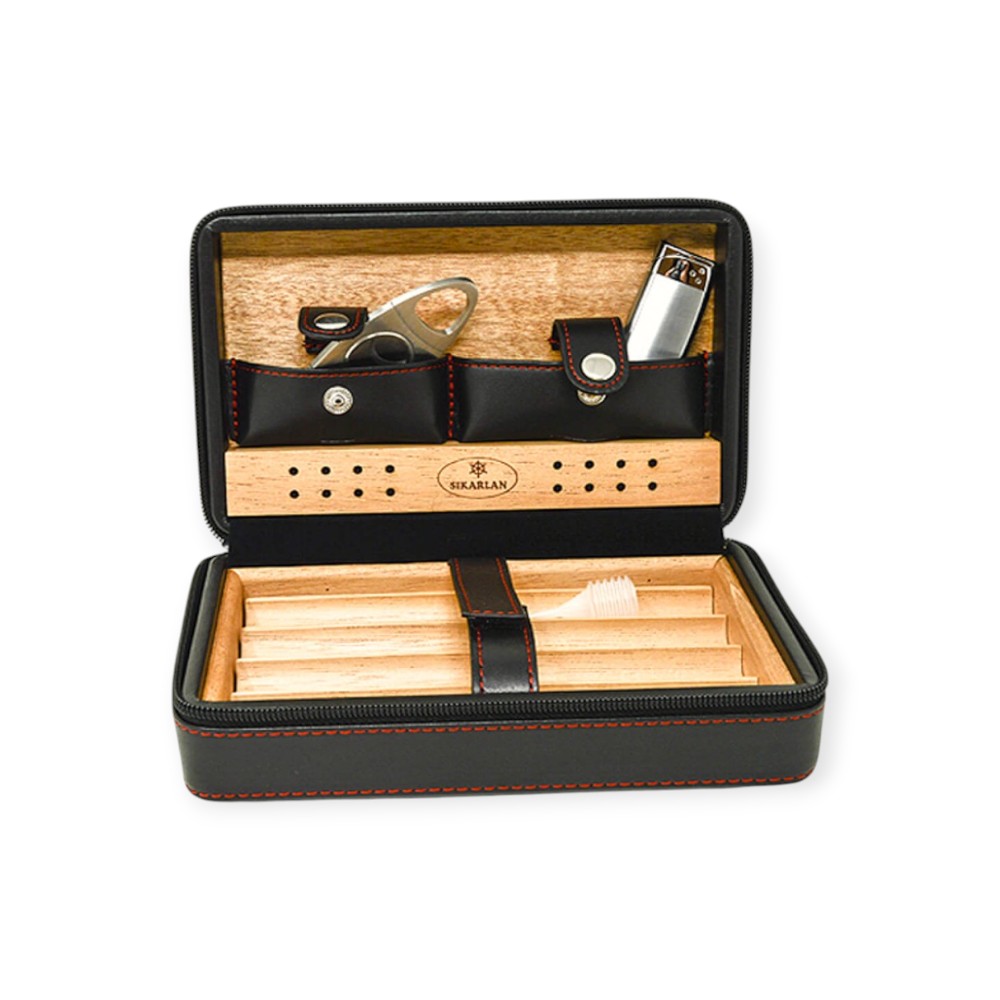 Υγραντήρας Ταξιδίου Δερμάτινος Σετ Sikarlan με υγραντικό στοιχείο, αναπτήρα και μεταλλικό πουροκόφτη.