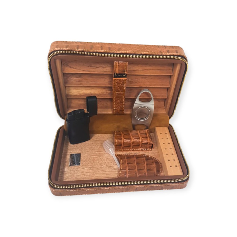 Υγραντήρας Ταξιδίου Δερμάτινος Σετ Sikarlan με υγραντικό στοιχείο, αναπτήρα και μεταλλικό πουροκόφτη.