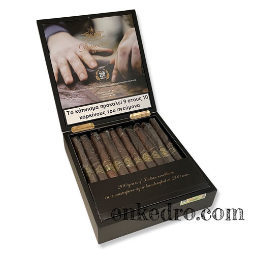 Το Duecento είναι ιταλικό για διακόσια. Στην πραγματικότητα, αυτό το λεπτό πούρο premium κατασκευάστηκε με μέτρο μήκους 200 mm ((7” 3/4) με μετρητή 46 δακτυλίων.