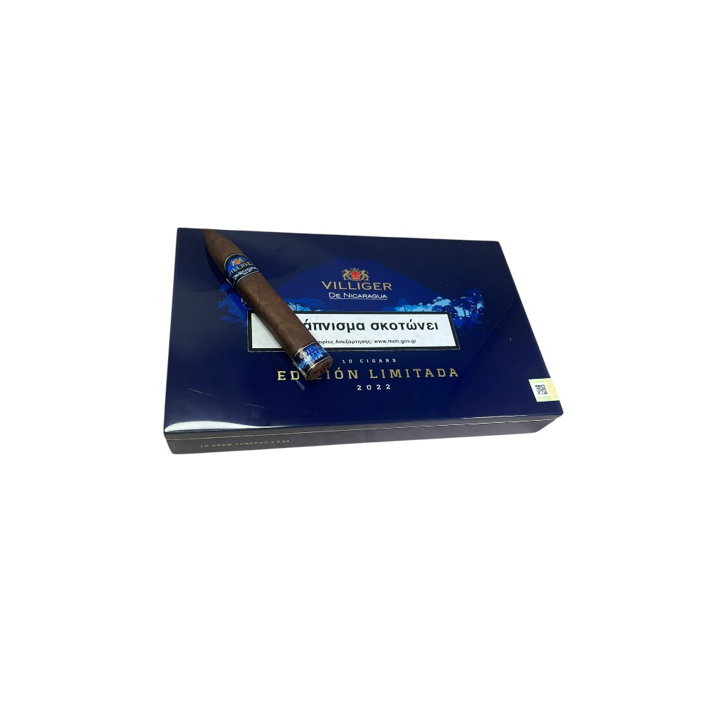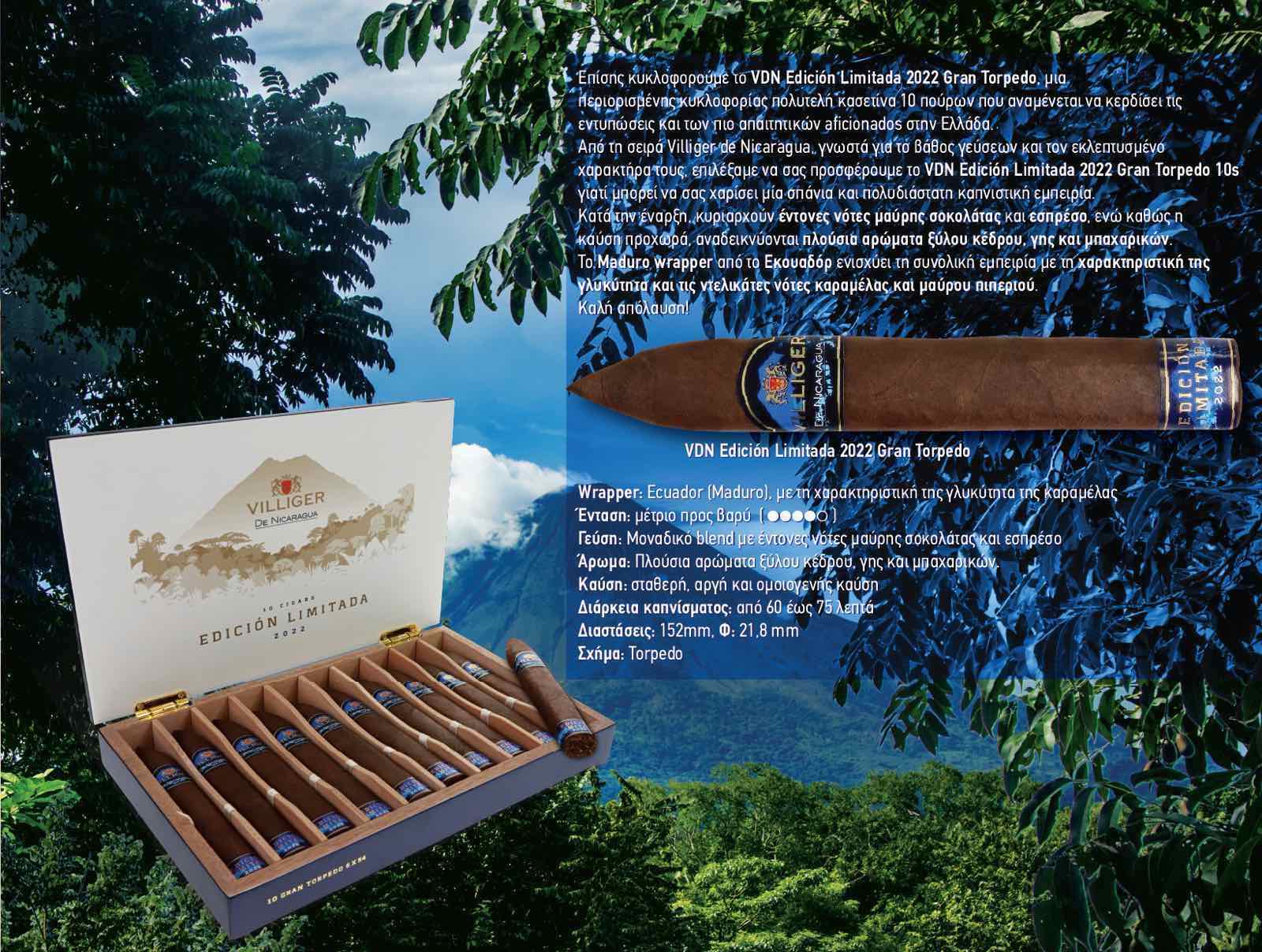 Από τη σειρά Villiger de Nicaragua, γνωστά για το βάθος γεύσεων και τον εκλεπτυσμένο χαρακτήρα τους, επιλέξαμε να σας προσφέρουμε το VDN Edicion Limitada 2022 Gran Torpedo 10s γιατί μπορεί να σας χαρίσει μία σπάνια και πολυδιάστατη καπνιστική εμπειρία.Κατά την έναρξη κυριαρχούν έντονες νότες μαύρης σοκολάτας και εσπρέσο, ενώ καθώς η καύση προχωρά, αναδεικνύονται πλούσια αρώματα ξύλου κέδρου, γης και μπαχαρικών. Το Maduro wrapper από το Εκουαδόρ ενισχύει τη συνολική εμπειρία με τη χαρακτηριστική της