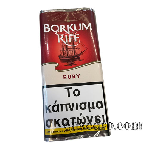 O Borkum Riff Ruby αποτελείται από καπνά burley, centucky και Cavendish εμπλουτισμένο με την πολυτελή γεύση κερασιών και μια πινελιά βανίλιας με αποτέλεσμα να δημιουργηθεί ένας υπέροχος καπνός με υπέροχο άρωμα.