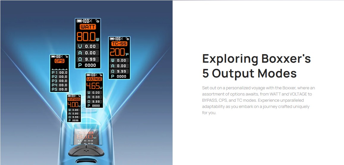 Επιλέξτε ανάμεσα σε πέντε διαφορετικές λειτουργίες ατμίσματος που προσφέρει το Boxxer Mod, προσαρμόζοντας τη συσκευή στις προσωπικές σας ανάγκες και προσδοκίες για ένα μοναδικό ατμιστικό ταξίδι.