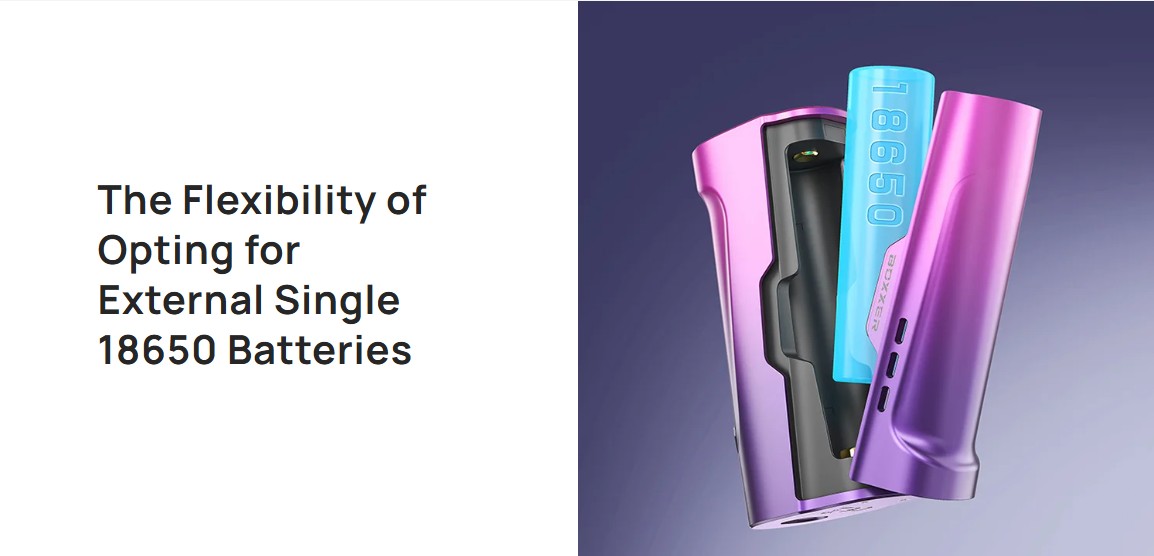 Το Boxxer Mod προσφέρει τη δυνατότητα χρήσης εξωτερικής μπαταρίας 18650 (δεν περιλαμβάνεται), επιτρέποντάς σας να επιλέξετε τον τύπο, τη μάρκα και την ποιότητα της μπαταρίας που προτιμάτε.