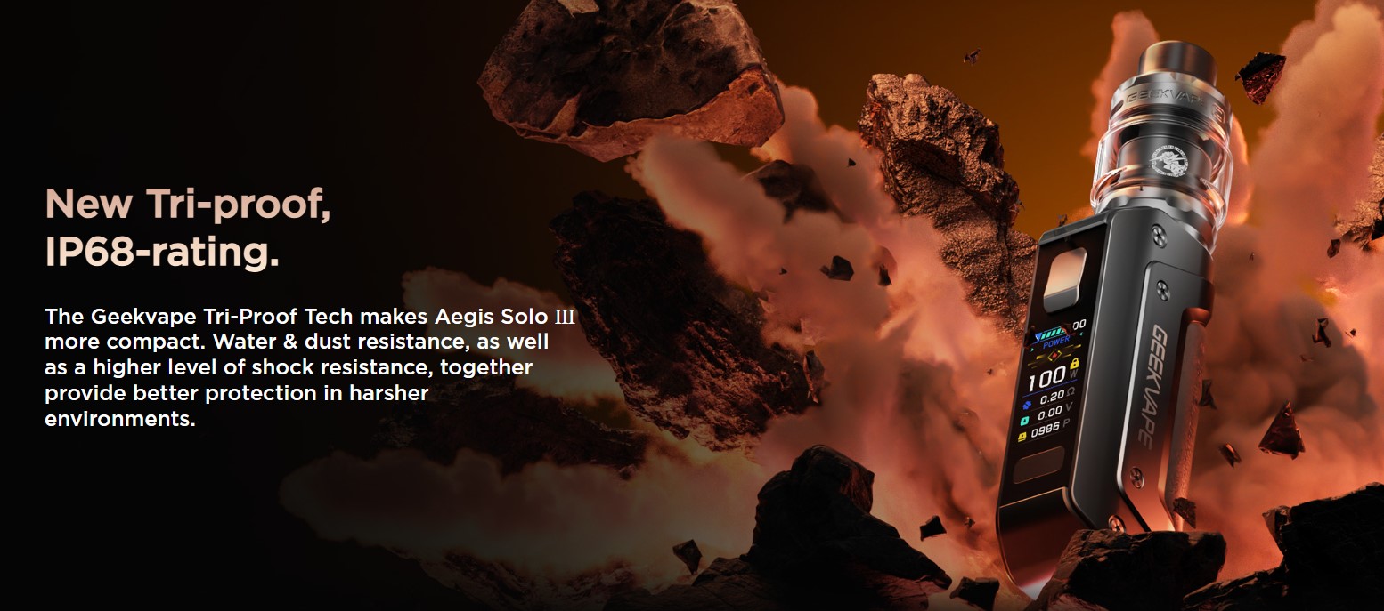 Το Aegis Solo 3 Mod από τη Geekvape ανεβάζει τον πήχη στο άτμισμα, προσφέροντας πρακτικότητα και ανθεκτικότητα με χαρακτηριστικά που διευκολύνουν τη χρήση και προσαρμόζονται σε κάθε περίσταση. Με την πιστοποίηση IP-68 Tri-proof, το Solo 3 είναι φτιαγμένο για να αντέχει σε σκληρές συνθήκες, προστατεύοντας από νερό, σκόνη και κραδασμούς, παρέχοντας απόλυτη αξιοπιστία.