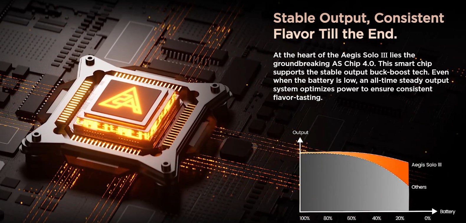 Η συσκευή υποστηρίζει πολλές λειτουργίες, δίνοντας ευελιξία στους ατμιστές για να προσαρμόσουν την εμπειρία τους, ενώ η δυνατότητα αλλαγής της μπαταρίας 18650 εξασφαλίζει συνεχή χρήση χωρίς διακοπές. Το προηγμένο AS Chip 4.0 βελτιώνει την απόδοση με τη λειτουργία σταθερής εξόδου ισχύος, ώστε να προσφέρει σταθερή και πλούσια γεύση, ακόμα και όταν η μπαταρία πλησιάζει στο τέλος της.