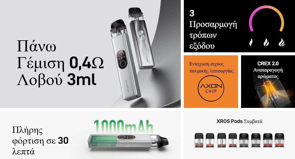 Το Vaporesso Xros 4 Pod είναι η νέα συσκευή pod από τη σειρά XROS, διαθέτει τη νέα κάψουλα 0.4Ω και προσφέρει μια εξαιρετική εμπειρία γεύσης, χάρη στη λειτουργία AXON Super Pulse και την τεχνολογία θέρμανσης COREX.
