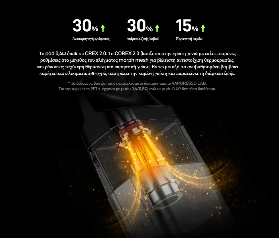 Η νέα 0.4Ω κάψουλα με την τεχνολογία θέρμανσης COREX παρέχει πιο πυκνά σύννεφα, πιο απαλή γεύση και πιο έντονη αίσθηση στο λαιμό. Η τεχνολογία θέρμανσης COREX υποστηρίζει την ακριβή γεύση και τη μακρά διάρκεια ζωής της κάψουλας. Μέσα στη συσκευασία θα βρείτε και την 0.8Ω κάψουλα.