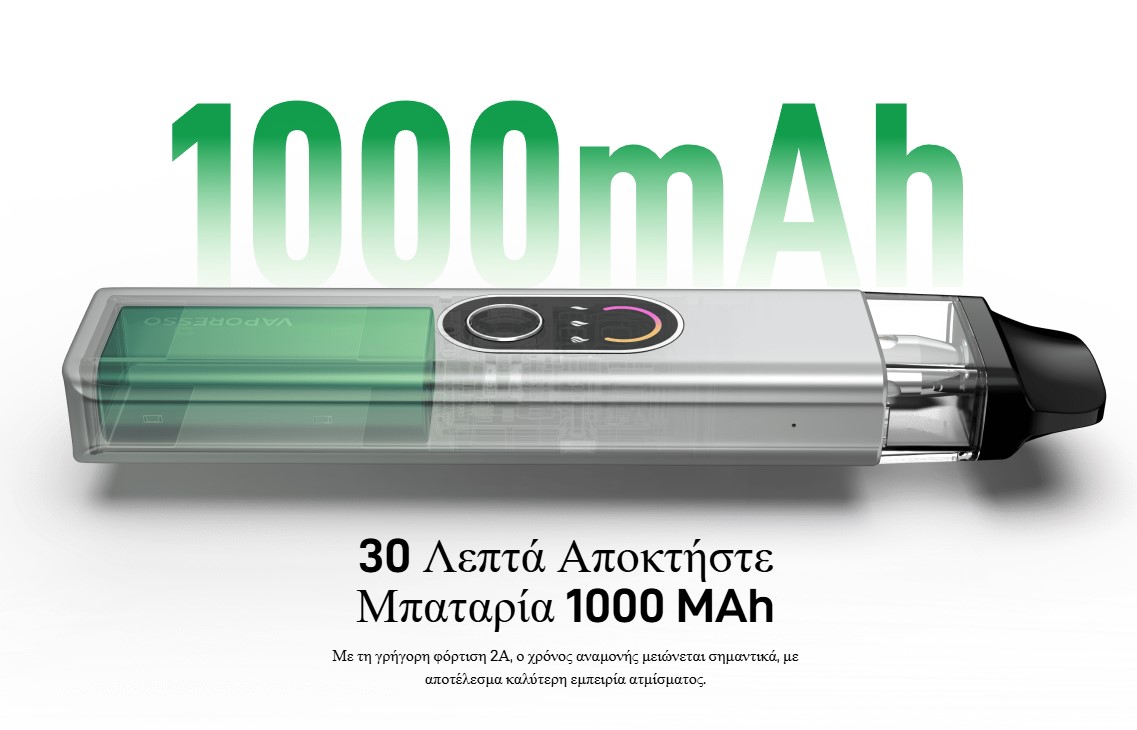 Τροφοδοτείται από μια ενσωματωμένη μπαταρία 1000mAh που διαθέτει εξαιρετική αυτονομία για άτμισμα χωρίς διακοπή. Η φόρτιση γίνεται μέσα σε 30 λεπτά, προσφέροντας εξοικονόμηση 50% στον χρόνο φόρτισης, με ταχύτητα 2A μέσω της θύρας USB Type-C.