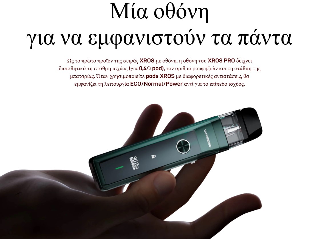 Ως το πρώτο προϊόν της σειράς XROS με οθόνη, η οθόνη του XROS PRO δείχνει τη στάθμη ισχύος (για 0,4Ω pod), τον αριθμό εισπνοών και